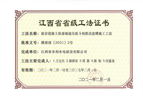 2021年2月1日,江西省住房和城鄉(xiāng)建設(shè)廳文件《關(guān)于公布我省2020年度第二批省級工程建設(shè)工法的通知》(贛建建〔2021〕2號)公布了2021年度第二批省級工程建設(shè)工法評審結(jié)果,其中,公司申報(bào)的《小直徑深層攪拌防滲墻二次成墻改進(jìn)攪拌頭施工工法》、《嵌巖混凝土防滲墻液壓抓斗純抓發(fā)造槽施工工法》審定為“2020年度省級工程建設(shè)工法”。