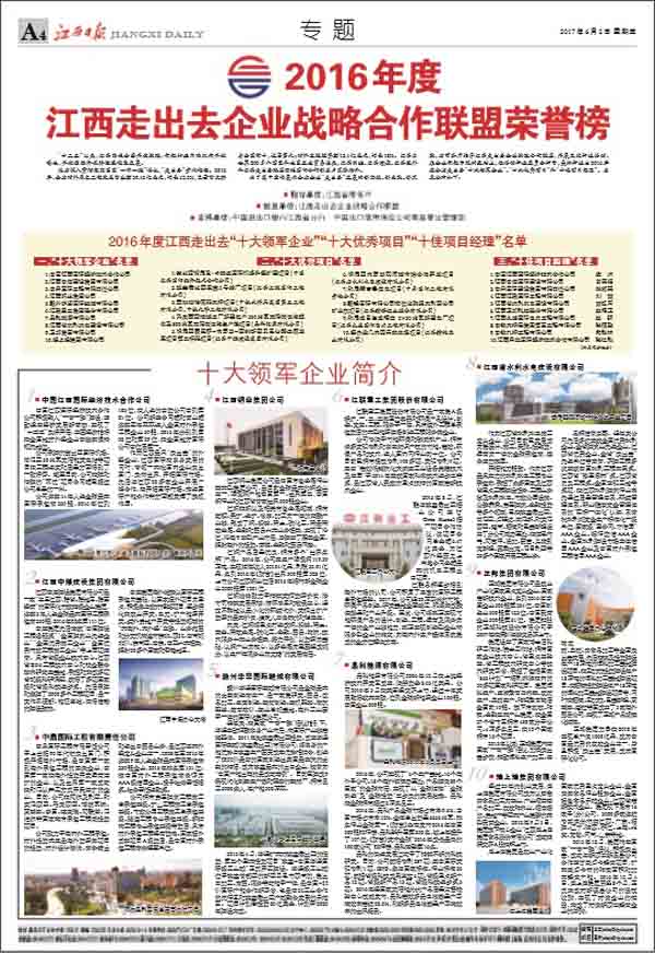 6月3日,江西走出去企業(yè)戰(zhàn)略合作聯(lián)盟2017年大會在南昌召開。省委常委、常務副省長毛偉明出席大會并作重要講話,會上省委常委、常務副省長毛偉明、省政府秘書長王亞聯(lián)和省商務廳廳長王水平分別為2016年度全省走出去“十大領軍企業(yè)”、“十大優(yōu)秀項目”和“十佳項目經(jīng)理”授牌。江西走出去企業(yè)戰(zhàn)略合作聯(lián)盟輪值主席、中國江西國際經(jīng)濟技術合作公司總經(jīng)理徐國建報告了2016年工作,國家開發(fā)銀行江西分行、中國進出口銀行江西省分行和中國出口信用保險公司南昌營管部作為聯(lián)盟副主席單位發(fā)言。公司董事長王元旦作為十大優(yōu)秀項目的企業(yè)代表發(fā)言?!督魅請蟆贰ⅰ督餍l(wèi)視》相繼對大會進行了大幅報道。