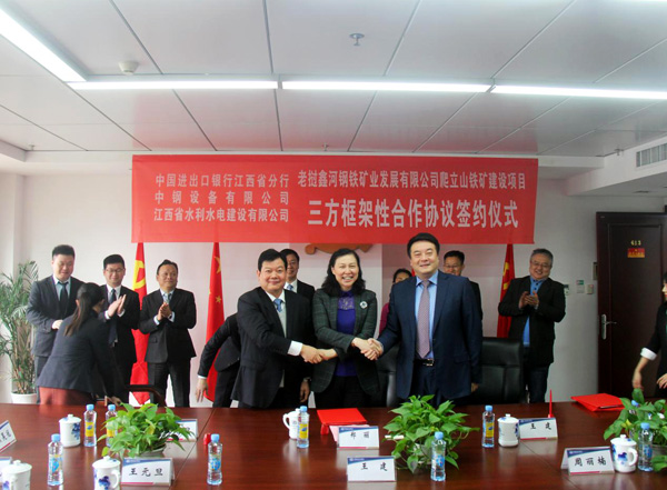 12月29日上午,在江西省商務廳副廳長方向軍、外經(jīng)處處長王健的見證下,公司與中國進出口銀行江西省分行和中鋼設備有限公司就老撾鑫河鋼鐵礦業(yè)發(fā)展有限公司爬立山鐵礦建設項目正式簽訂三方框架性合作協(xié)議。中國進出口銀行江西省分行行長鄭麗、中鋼設備有限公司總經(jīng)理王建、公司董事長王元旦、海外公司總經(jīng)理黃鄭民等出席簽約儀式。
