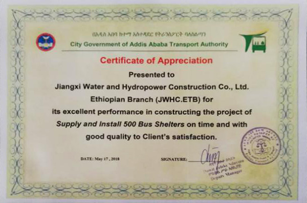 近日,埃塞有限公司收到亞的斯亞貝巴市交通局頒發(fā)的感謝證書,表彰公司在承建亞的斯亞貝巴市500套公交候車亭供貨與安裝項目上表現(xiàn)優(yōu)異。