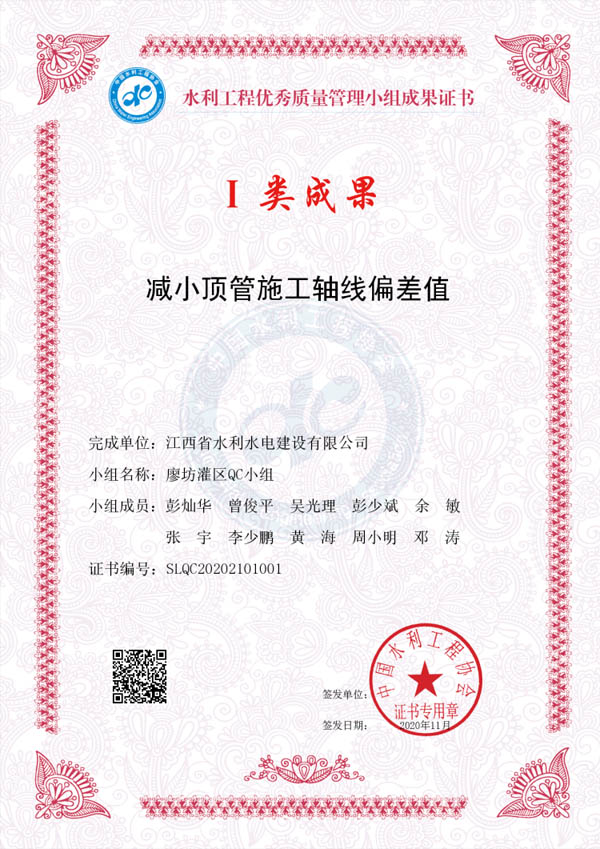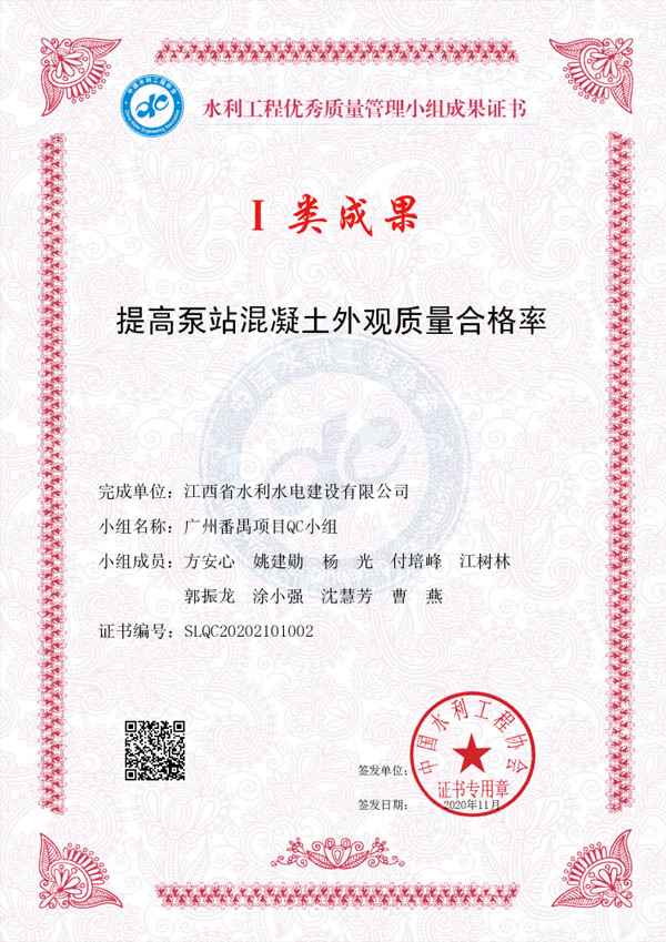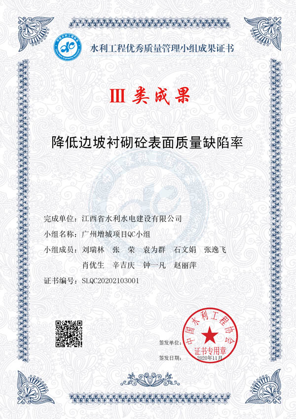 其中:廖坊灌區(qū)QC小組編寫(xiě)的《減小頂管施工軸線(xiàn)偏差值》獲I類(lèi)成果獎(jiǎng)、廣州番禺項(xiàng)目QC小組編寫(xiě)的《提高泵站混凝土外觀質(zhì)量合格率》獲I類(lèi)成果獎(jiǎng)、廣州增城項(xiàng)目QC小組編寫(xiě)的《降低邊坡襯砌砼表面質(zhì)量缺陷率》獲III類(lèi)成果獎(jiǎng)。