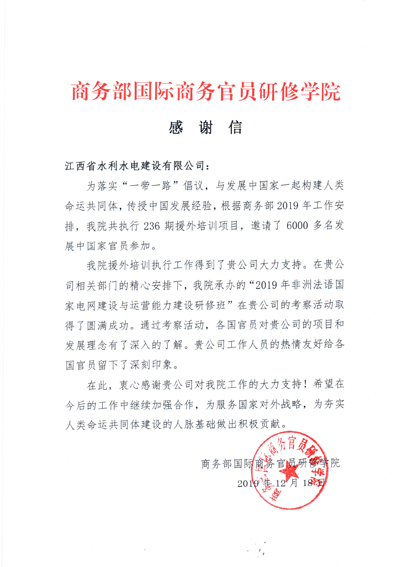 人力資源2019年,公司圍繞國家和我省“走出去”戰(zhàn)略,積極配合商務(wù)部及省內(nèi)援外培訓(xùn)工作,得到各方認(rèn)可。近日,公司收到來自商務(wù)部國際商務(wù)官員研修學(xué)院的感謝信,信中提到,商務(wù)部研修學(xué)院援外培訓(xùn)工作得到我公司的大力支持,“2019年非洲法語國家電網(wǎng)建設(shè)與運(yùn)營能力建設(shè)研修班”考察、交流活動(dòng)取得圓滿成功,對(duì)公司的積極配合表示衷心感謝。