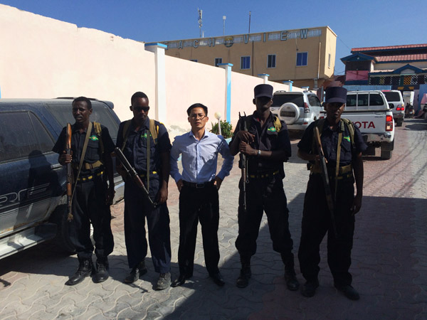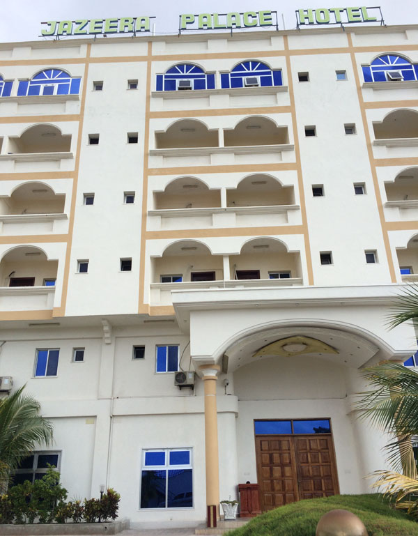 我們?nèi)胱〉氖前雿u皇宮酒店,也是中國駐索使館的臨時辦公產(chǎn)所。三道門的安全防護可謂警備森嚴(yán),戰(zhàn)爭國家的氣象從這可見一斑。酒店內(nèi)布置簡單,但設(shè)施齊全,與酒店外充滿殺氣的氣氛不同,酒店內(nèi)人來人往,商人喝著咖啡悠閑地談著生意。我們也坐著邊喝咖啡邊商談工作計劃,不時有索馬里人來打招呼,用中文說“你好”,并客氣地握手表示熱情歡迎來到摩加迪沙。
