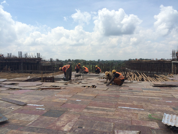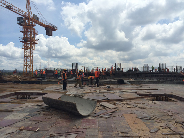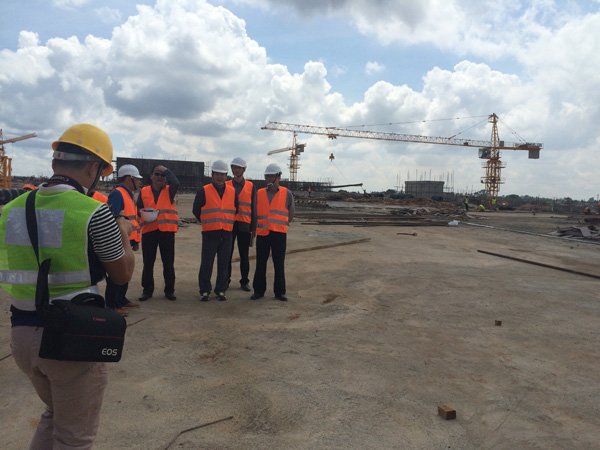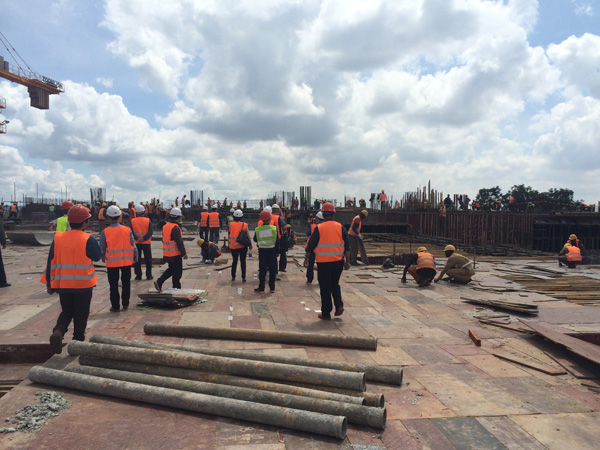“雙河”項(xiàng)目是一個(gè)集零售商場(chǎng)、現(xiàn)代辦公樓、公共娛樂以及配套設(shè)施的綜合性工程,作為東非最大的在建城市綜合體,總建筑面積為18.2萬平方米,單層面積就超過四萬多平米。雖然出國(guó)前我對(duì)“雙河”項(xiàng)目就有一定的了解,但親臨現(xiàn)場(chǎng),感受工地的壯觀,內(nèi)心仍然受到巨大的震撼。這個(gè)項(xiàng)目涉及到的工程類別較多,施工統(tǒng)籌及安全質(zhì)量監(jiān)控難度較大。在施工現(xiàn)場(chǎng),我們看到各作業(yè)工種工作安排得井井有條,各類安全標(biāo)識(shí)及安全設(shè)施科學(xué)規(guī)范,雖然現(xiàn)場(chǎng)施工作業(yè)人數(shù)超過1000多人,但讓人感覺既熱火朝天,又忙而不亂有條不紊地進(jìn)行著。