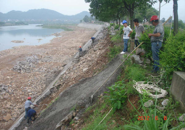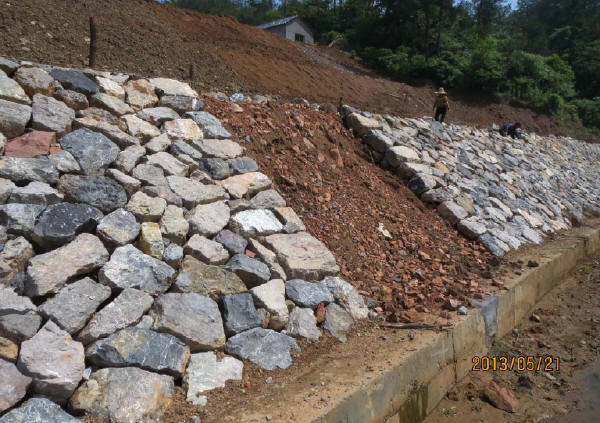 砌石護坡和擋墻面石外露面要求顏色一致,最小厚度應不少于20cm,砌筑時,上下兩層石塊應騎縫,避免通縫,內(nèi)外石塊應交錯搭接。不得在面石底面無漿墊塞片石。對有勾凸縫(縫寬一般2.5cm)要求的面石,其砌縫縫寬不應大于2.0cm。