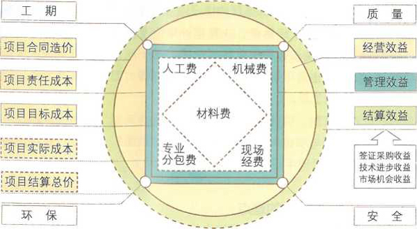 “方圓圖”是具有操作性的工具。其一,“方圓圖” 完整詮釋了建筑項目管理行為間的關系。“接項目”確定了合同造價,對應方圓圖的實線圓;“做項目”的第一步是下達項目目標責任書,確定項目責任成本,對應方圓圖的責任成本方形,第二步分子公司在責任書的基礎上進行項目實施策劃,產(chǎn)生項目的目標成本,對應方圓圖的目標成本方形,第三步就是項目實施過程的管控,最終確定實際成本,對應方圓圖的實際成本方形?!八阗~收錢”就是完成項目過程中的結算變更與最后的決算收款,從而確定結算造價,對應方圓圖的結夢造價虛線圓。項目實施過程中進度、質(zhì)量、安全、環(huán)保及周邊相關 方的管理對應成本方形的四個支撐頂點,構成成本的五項費用“材料、人工、機械、現(xiàn)場經(jīng)費、專業(yè)分包”對應成本方形的內(nèi)部區(qū)域。